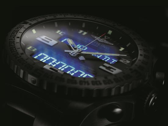 百年灵驾驶舱计时B50腕表(Cockpit B50)的数字显示设计也颇有创新之处,以确保腕表在任何情况下都能清晰易读。两个黑底白字的液晶显示屏(LCD)均配备高性能背光照明显示系统,只需轻按表冠即能启动该高科技装置,不论白昼黑夜,液晶显示屏的亮度和清晰度都绝对出色,可谓真正的腕间仪表板。腕表还拥有独家“倾斜”(tilt)功能,当佩戴者将手腕倾斜至35度以上时,背光照明显示系统将会自动开启,该功能在驾驶飞机或汽车时极为便捷高效。另一项令人惊喜的全新特点是其超大号的数字显示,12点钟位置的液晶显示屏提供7位数显示,每个数位包含14个笔段,因而可以通过不同笔段的组合实现所有英文字母的显示,得以提供更便捷的交互性操控。